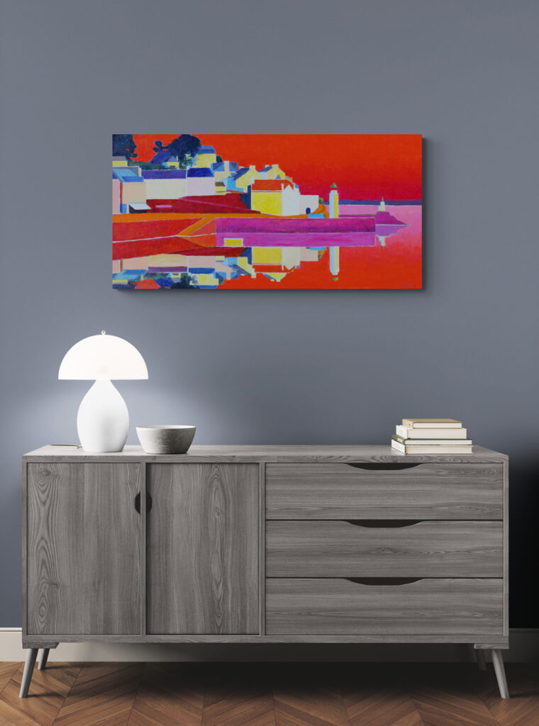 Paysage revisité du célèbre port de Sauzon qui se trouve à Belle Ile en Mer ( Morbihan, France). Je reprend partiellement ici une harmonie de couleurs découverte dans une œuvre de Nicolas de Staël réalisée en 1952. J’ai moi aussi essentiellement travaillé au couteau cette peinture afin de privilégier la matière et l’expressivité des couleurs et d’obtenir une approche pleine d’énergie. Les contrastes audacieux et les colorations libres contribuent à l’aura de cette création puissante et sans concessions.