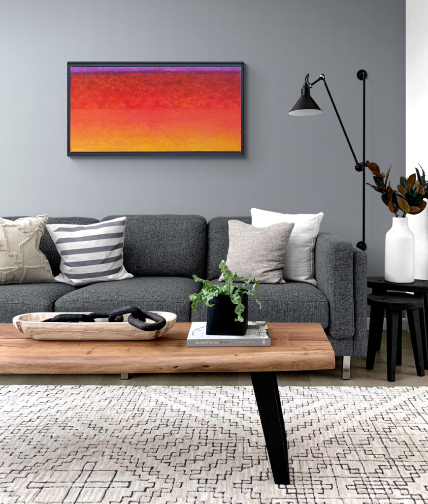 Voici une création originale qui fait partie des toutes premières de la série Bright. Un tableau imaginaire qui évoque partiellement un paysage de forêt. Cette composition audacieuse a été travaillée au couteau à peindre et ensuite finalisée avec des glacis légers. Nous avons donc ici une surface peinte qui accroche la lumière suivant l’endroit ou elle est exposée tout en gardant des couleurs profondes. Un travail haut de gamme autour de la couleur rouge, une œuvre d’une grande présence. Je propose cette création encadrée par une caisse américaine noire (format encadré 56,6×106,6 cm).