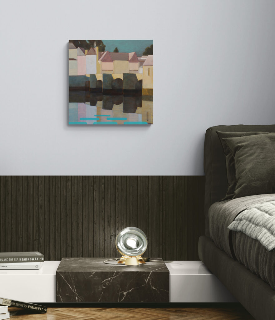J’ai voulu capturer la lumière de fin de journée sur le pont de Saint Goustan (Morbihan – France). Les contrastes de lumière et de couleur sont renforcés par toutes les formes géométriques et les reflets. Le minimalisme de cette création contemporaine cache une belle préparation avant la réalisation définitive. Le choix des couleurs qui articulent cette œuvre est basé sur ma volonté de proposer une atmosphère tranquille. Parfois une création artistique invite au calme et au repos des sens, elle ressource celle où celui qui la possède.