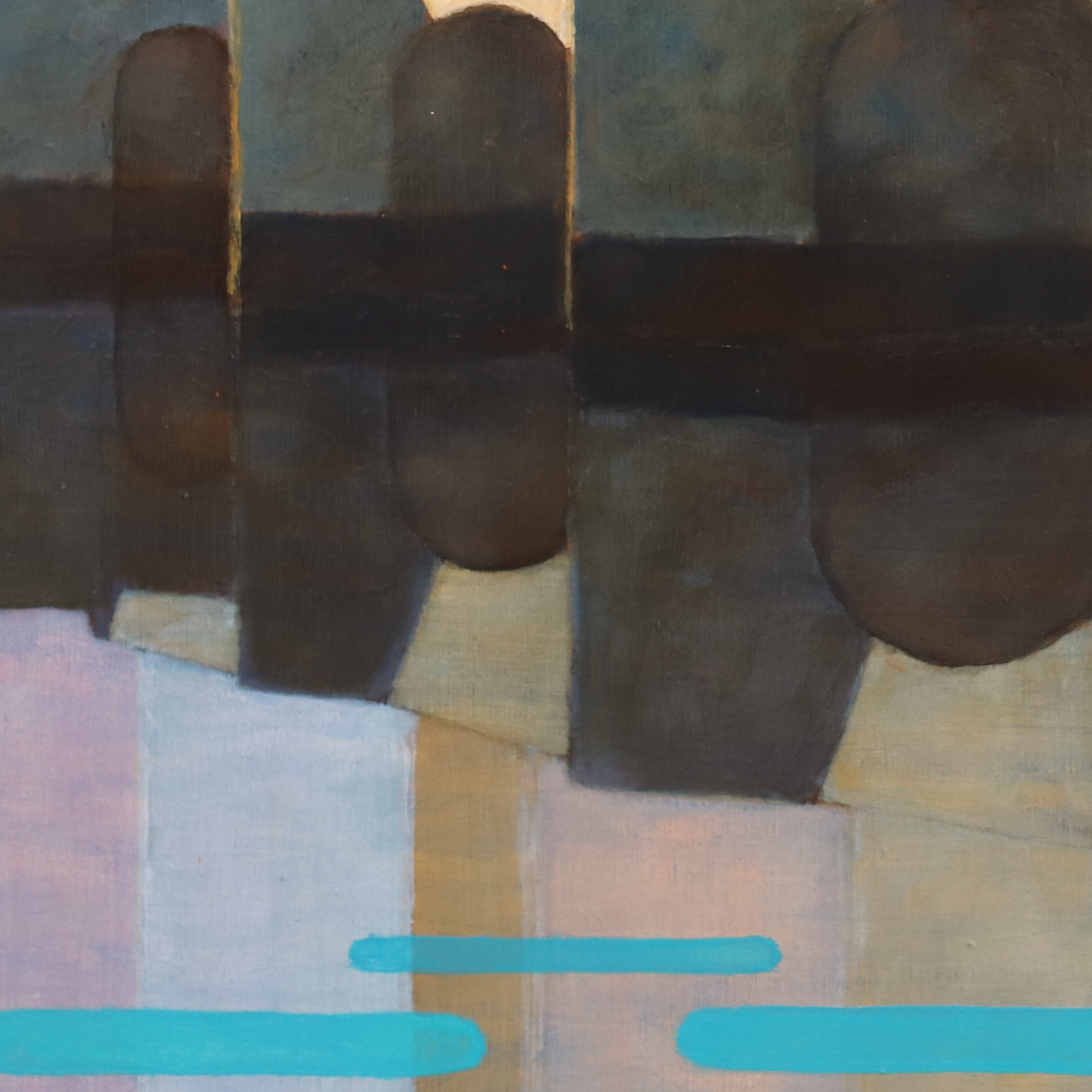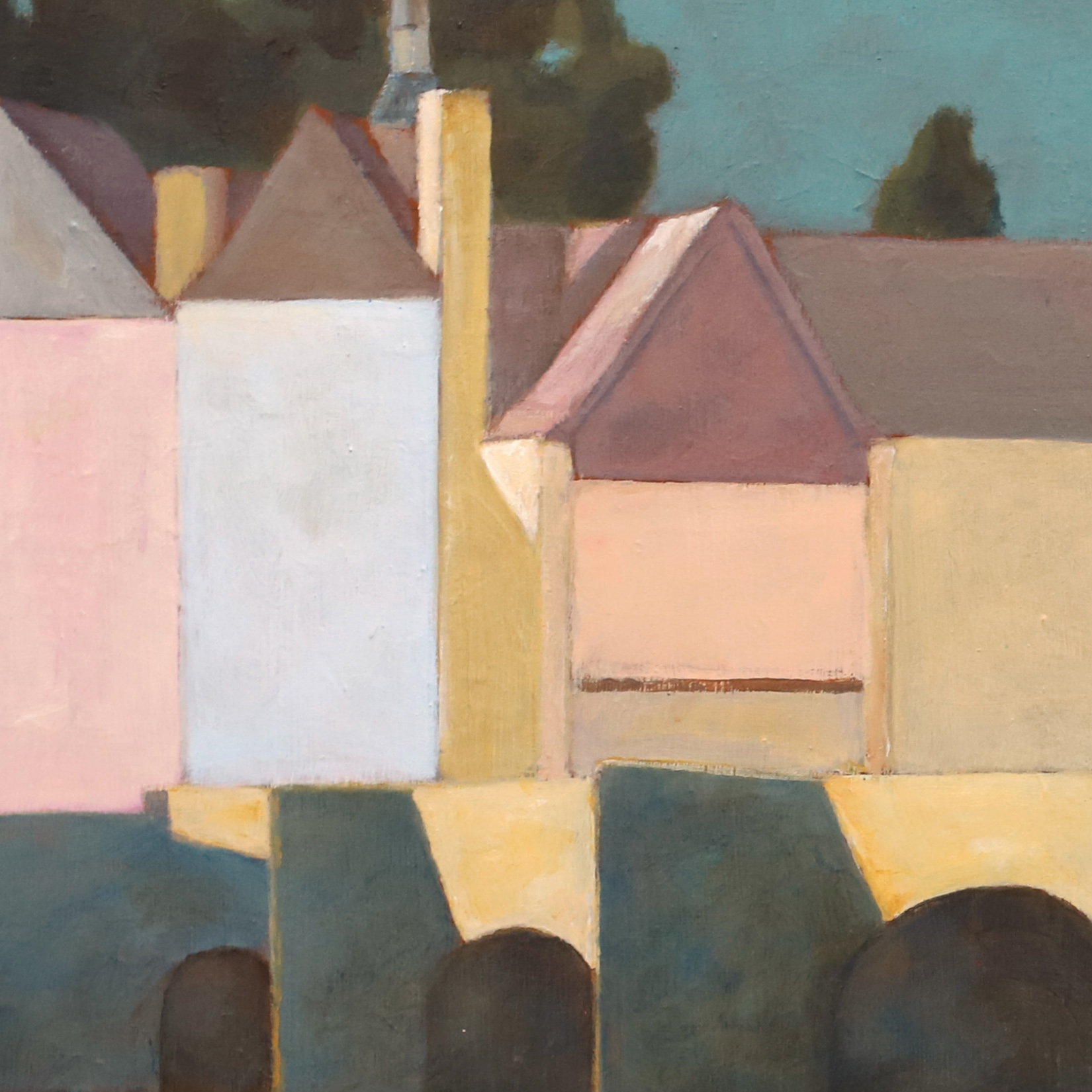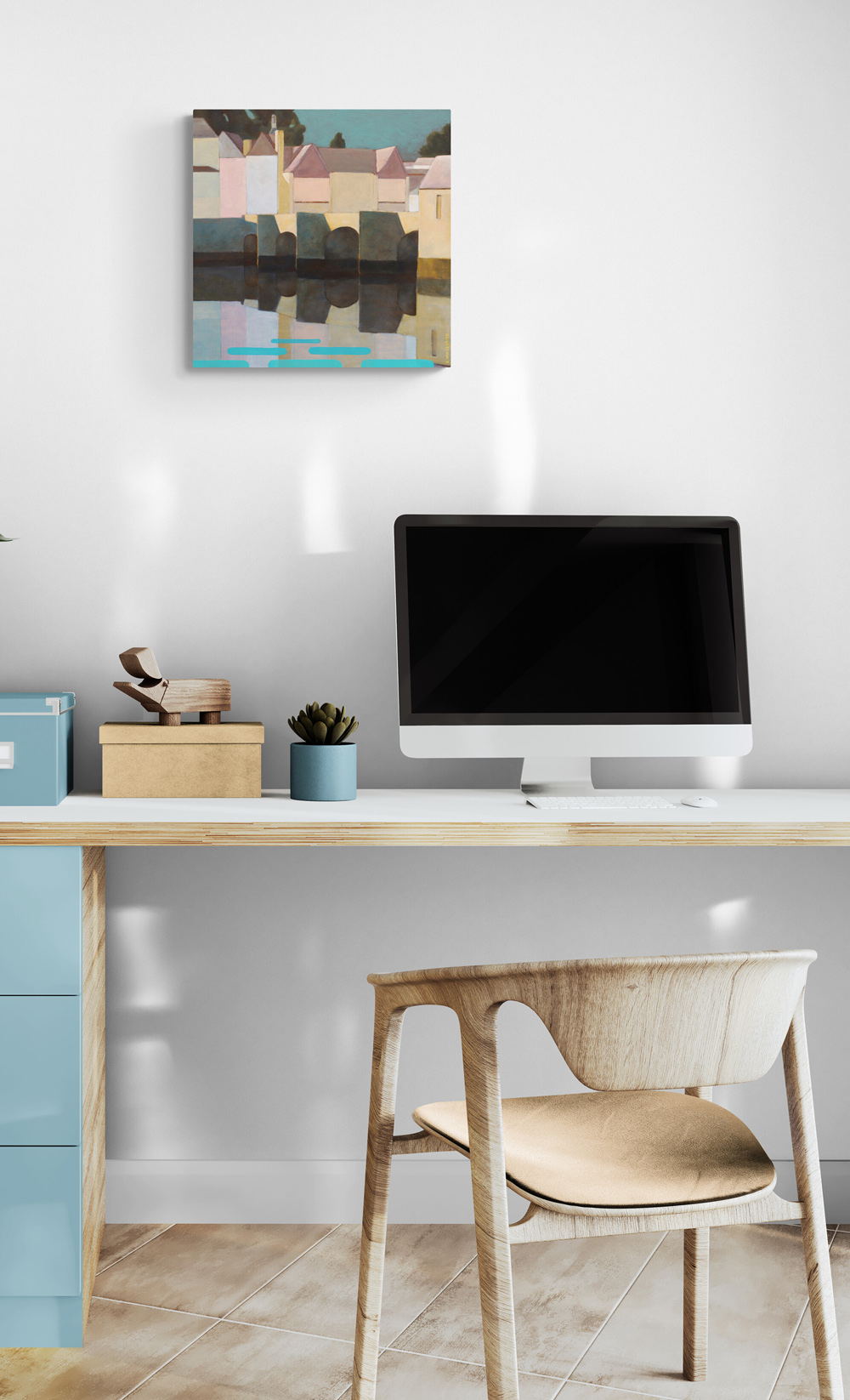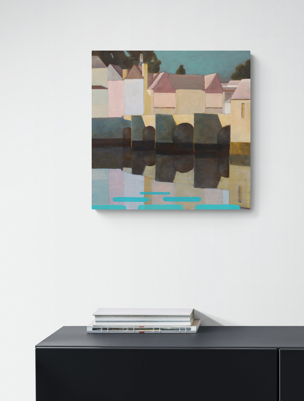 J’ai voulu capturer la lumière de fin de journée sur le pont de Saint Goustan (Morbihan – France). Les contrastes de lumière et de couleur sont renforcés par toutes les formes géométriques et les reflets. Le minimalisme de cette création contemporaine cache une belle préparation avant la réalisation définitive. Le choix des couleurs qui articulent cette œuvre est basé sur ma volonté de proposer une atmosphère tranquille. Parfois une création artistique invite au calme et au repos des sens, elle ressource celle où celui qui la possède.