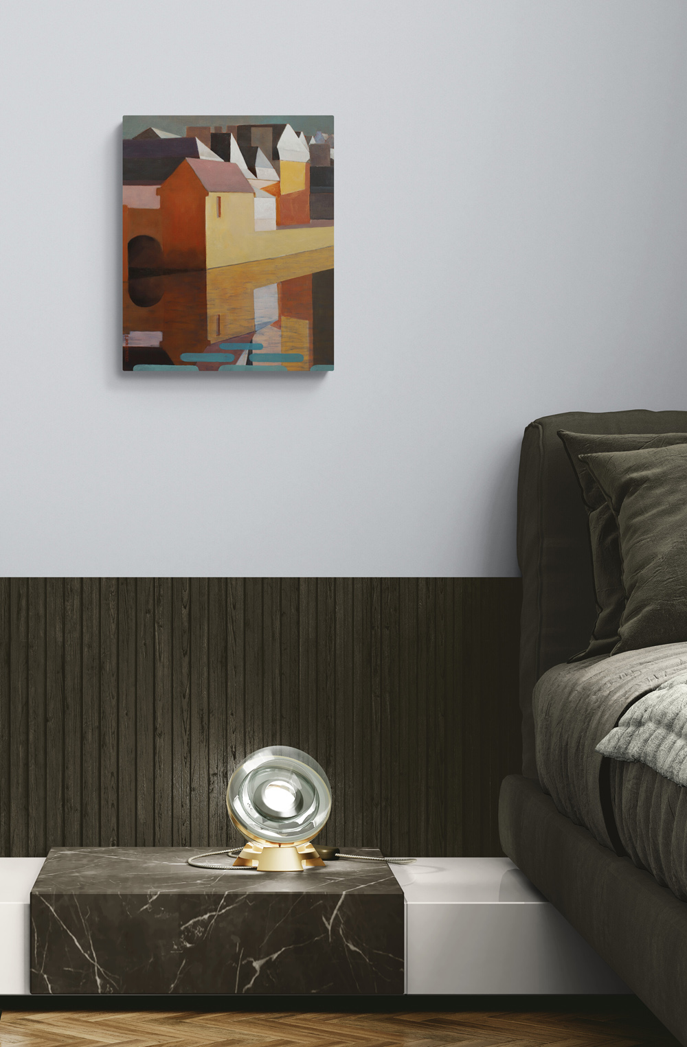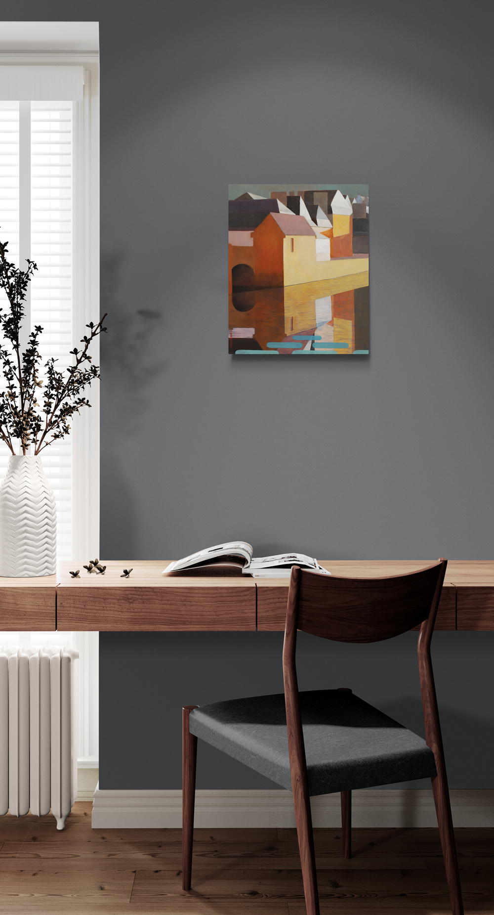 Cette œuvre est une invitation au calme et à la contemplation. J’ai joué avec la lumière du matin et simplifié les formes, créant un tableau plein de personnalité. Chaque couleur est réglée avec minutie pour traduire une atmosphère particulière à la fois simple et captivante. L’utilisation des contrastes, entre les couleurs chaudes et les couleurs froides, permet un certain dynamisme tout en conservant ici une ambiance sereine. Un tableau élégant et d’une belle présence pour votre espace de vie.