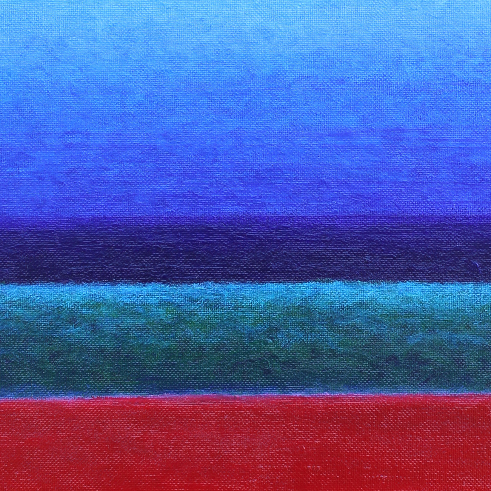 Dans cette œuvre, je cherche à créer une émotion immédiate en utilisant un accord de couleur audacieux et une lumière mystérieuse. L’huile me permet de travailler le rouge avec finesse et d’utiliser ses modulations plus ou moins froides pour suggérer l’espace. Cette couleur symbolise l’énergie vitale et la passion. Son contraste avec la partie haute du tableau, dont la lumière est presque nocturne, fait vibrer ce paysage moderne . Le minimalisme et l’expressionnisme fusionnent ici pour évoquer la passion des sentiments humains. Cette peinture ne peut laisser indifférent et son énergie intense vibre tout de suite dans le regard du spectateur.