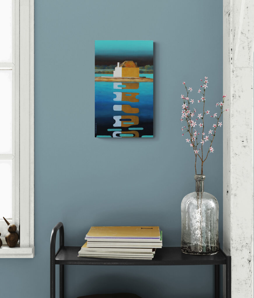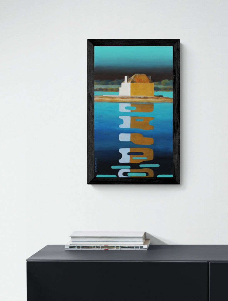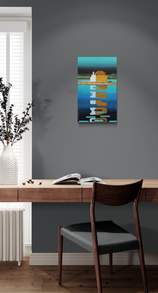 Dans cette œuvre unique, j’ai voulu faire une variation sur cet îlot isolé de la ria d’Etel (Morbihan – France) qui est un site emblématique de la région. Mon approche en synthèse et minimaliste me permet d’intensifier l’impact de mon travail des couleurs et de la lumière. Les formes semi-abstraites imaginées que l’on découvre dans l’eau amènent un contraste énigmatique avec l’architecture de la maison. Il y a toujours une conversation particulière entre la nature et les constructions humaines en particulier dans les reflets aquatiques. Ce tableau très lumineux invite immédiatement le regard et stimule tout de suite l’imaginaire.