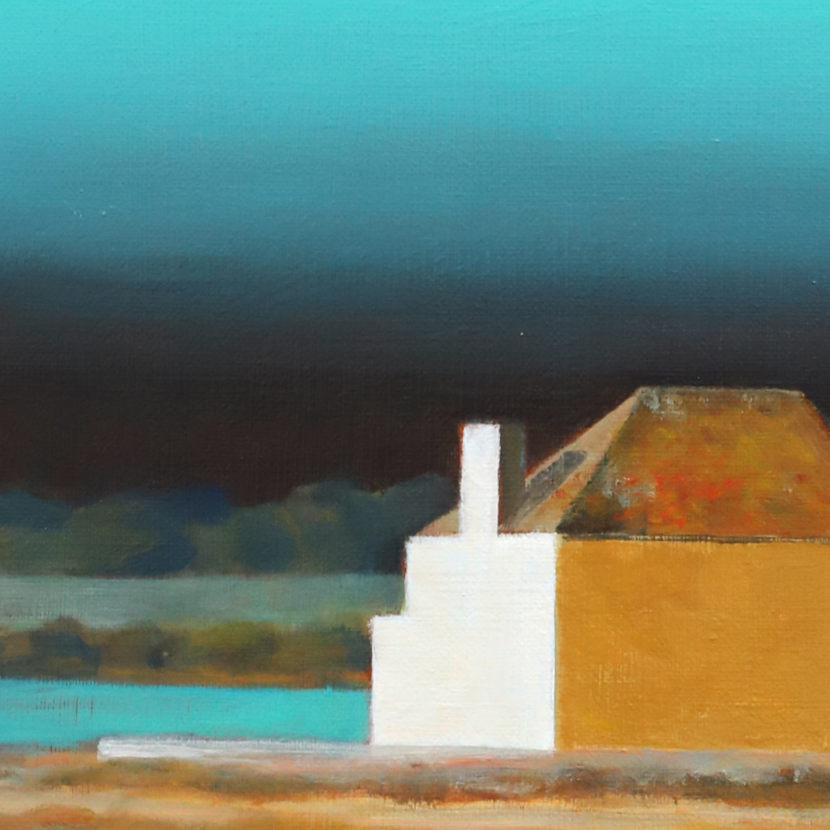 Dans cette œuvre unique, j’ai voulu faire une variation sur cet îlot isolé de la ria d’Etel (Morbihan – France) qui est un site emblématique de la région. Mon approche en synthèse et minimaliste me permet d’intensifier l’impact de mon travail des couleurs et de la lumière. Les formes semi-abstraites imaginées que l’on découvre dans l’eau amènent un contraste énigmatique avec l’architecture de la maison. Il y a toujours une conversation particulière entre la nature et les constructions humaines en particulier dans les reflets aquatiques. Ce tableau très lumineux invite immédiatement le regard et stimule tout de suite l’imaginaire.